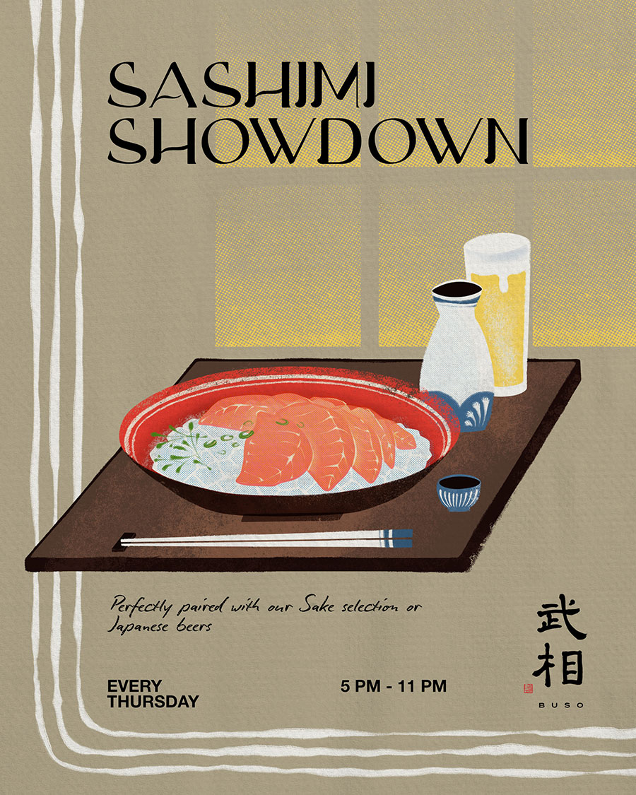 Sashimi Shodown happens every Wednesday at Buso Izakaya, from 5 pm to 11 pm. It is a night for fresh cuts, clean flavors, and unhurried eating. Drop in after work or make it your dinner plan. Stay for one plate or settle in for the night. Good sashimi, easy atmosphere, no rules.